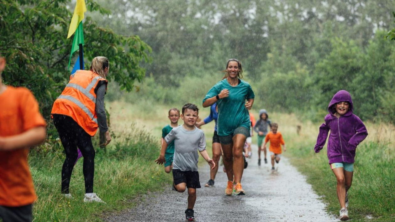 © SolStock/iStock for the fun run in the rain. Description: children running under the rain and being encouraged by two women.